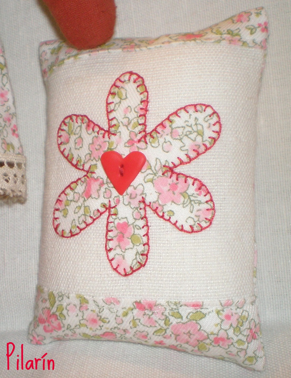 El cojincito está hecho con la técnica de aplicación de Patchwork. Es mi primera incursión pero creo que no será la última. ¡¡Me gusta cómo se realza la florecita!! Cómo he pensado en la "hermana Carmen" (la monjita que me enseñaba labores en la escuela primaria siendo yo una criatura), quien siempre me decía que el festón no era lo mío. Jajaja!!! A cada puntadita, iba pensando "si me viera ahora...!"