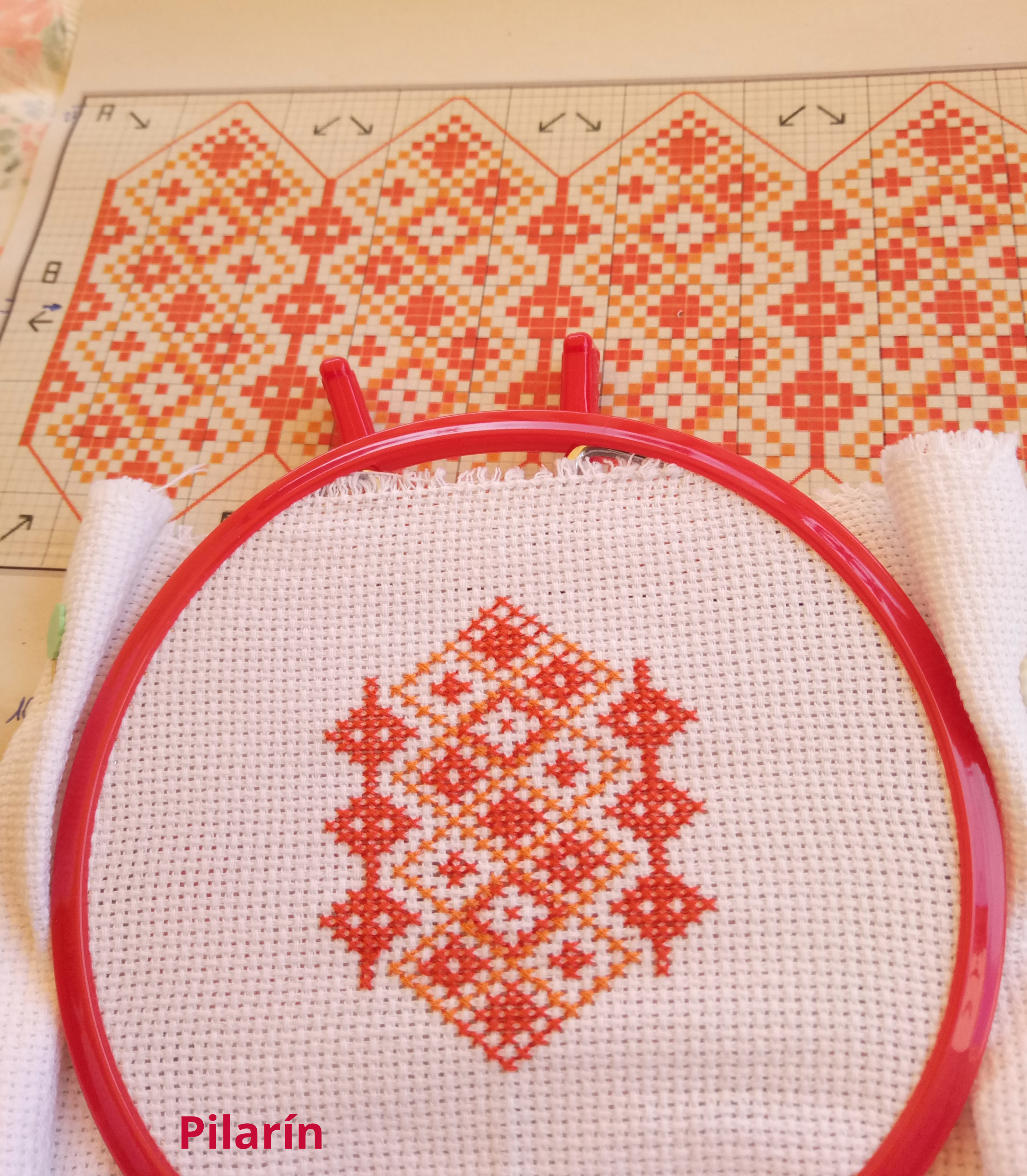 Un resto de tela Aida, dos colores naranjas y a disfrutar de las crucecitas.